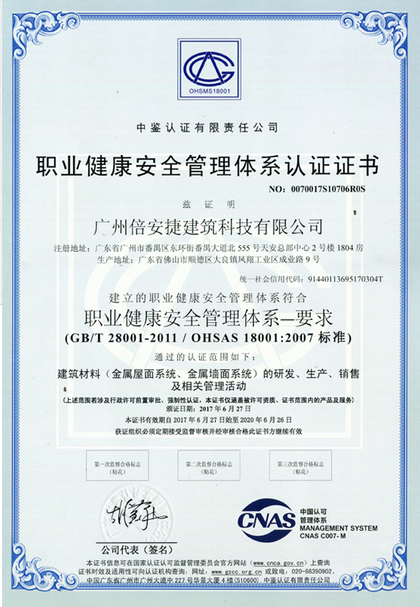 加上這個(gè)“OHSAS18001職業(yè)健康管理體系”,倍安捷的管理體系就更加完善了。ISO9001規(guī)范質(zhì)量管理,ISO14001運(yùn)行環(huán)境管理,OHSAS18001進(jìn)行職業(yè)健康管理,三大管理體系為倍安捷的前進(jìn)保駕護(hù)航。