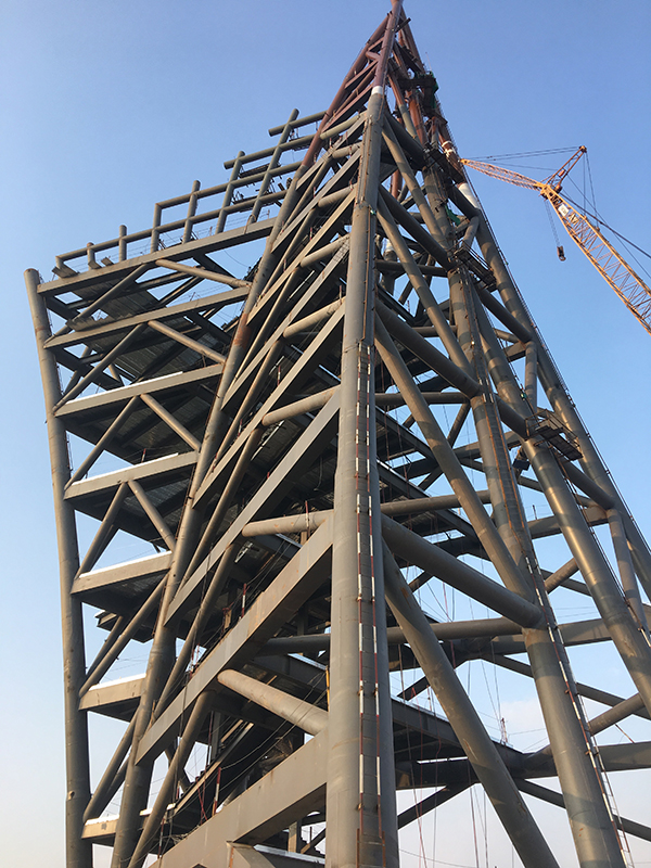 清泉閣建筑平面呈三角形,自上而下逐步旋轉(zhuǎn),形成扭曲的漏斗形曲面表皮。整體為空間鋼桁架結(jié)構(gòu)體系,閣身外圍采用倍安捷鋁鎂錳金屬屋檐幕墻系統(tǒng)。